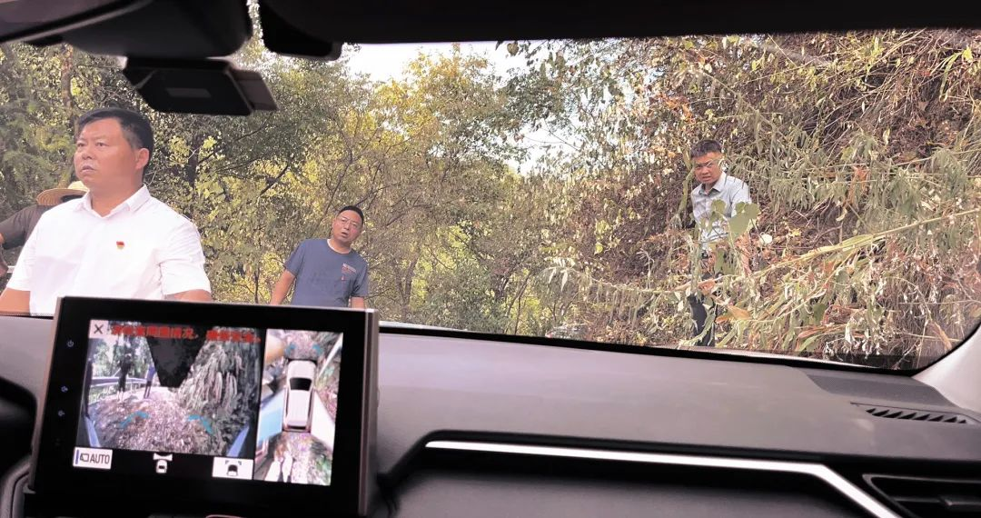 ▲由于探訪的路崎嶇、窄小,車輛需要多人指引調整前行